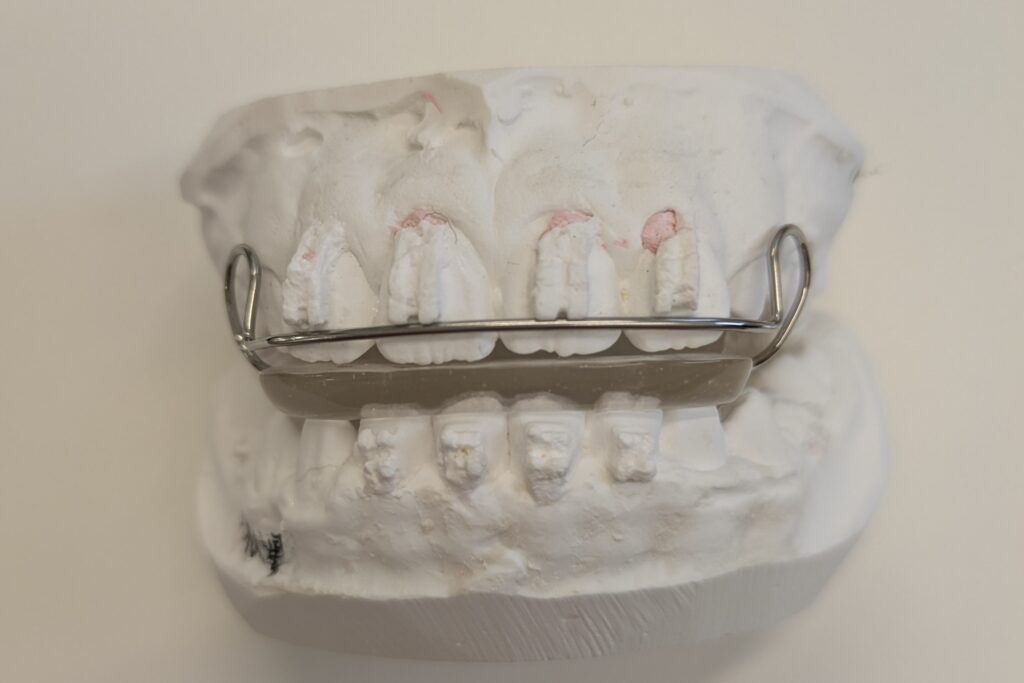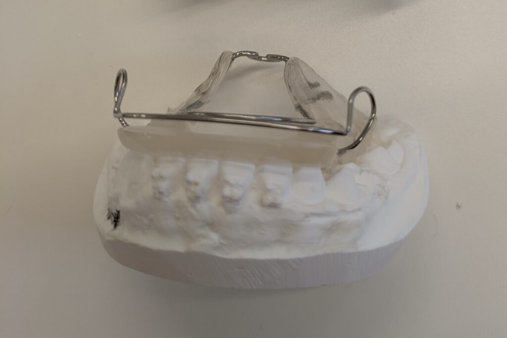 OC−1(バイオネーター1)は、取り外しができる矯正装置(可撤式装置)です。見た目は大きめのマウスピースのようで、プラスチック部分とワイヤー部分でできています。